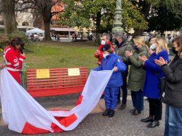 Donne della Croce Rossa posano una targa sulla Panchina della Gentilezza in piazza Bra.