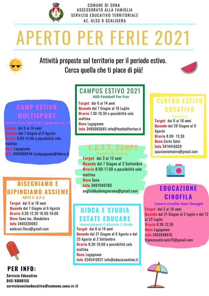 Lunedì 7 Giugno dalle ore 17:00 alle ore 19:00 in Piazza Roma a Sona si terrà la presentazione delle attività estive proposte dalle Associazioni del territorio e inserite nel volantino “Aperto per ferie 2021”.