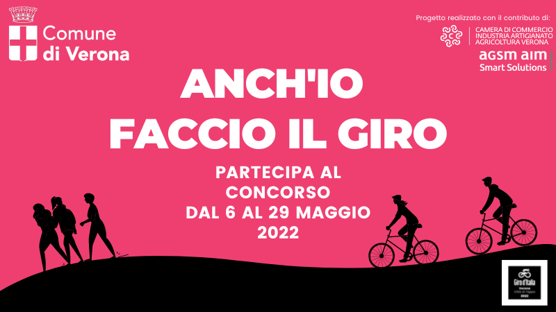 Prende il via venerdì 6 maggio 2022 il concorso “Anch’io faccio il Giro”, iniziativa per le cittadine e i cittadini veronesi nell’ambito del progetto “Muoversi” per la promozione della mobilità sostenibile in occasione del 105°Giro d’Italia 2022, che si concluderà con una cronometro individuale a Verona domenica 29 maggio 2022.