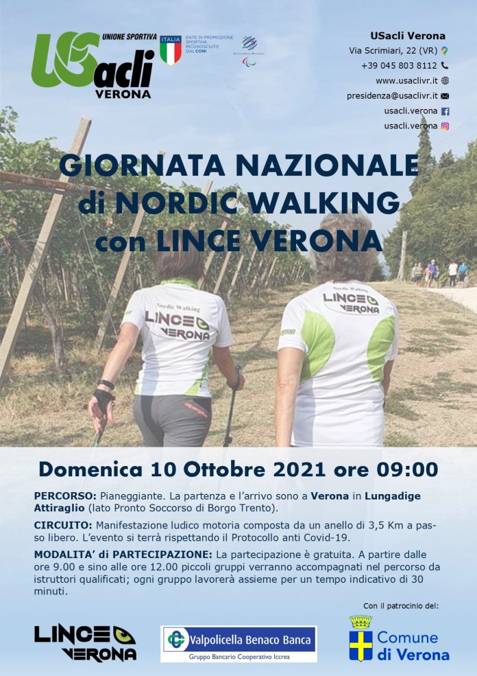 - Il primo evento è per domenica 10 ottobre, con la proposta, in occasione della giornata nazionale di Nordic Walking, di una passeggiata a passo libero, su percorso pianeggiante ad anello di 3,5 chilometri. Un’opportunità per imparare a conoscere e provare la pratica della camminata nordica, attività sportiva sempre più diffusa in Italia e nel mondo. La partenza e l’arrivo sono in lungadige Attiraglio, lato pronto soccorso di Borgo Trento. A partire dalle ore 9 e fino alle 12, piccoli gruppi, verranno accompagnati nel percorso da istruttori qualificati dell’associazione sportiva Lince Verona. Ogni gruppo lavorerà insieme per un tempo indicativo di circa 30 minuti. La partecipazione è gratuita.