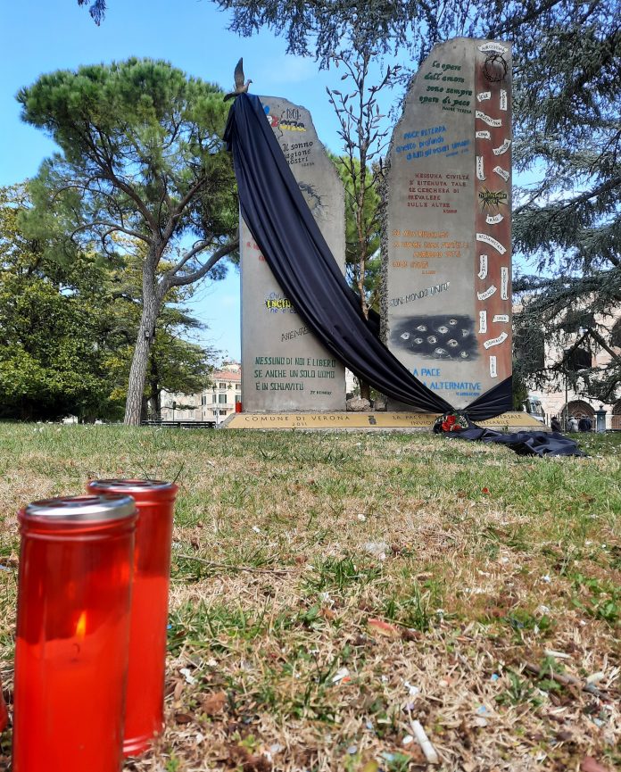 Un mazzo di rose, delle candele accese e un lungo drappo nero avvolge il monumento alla pace di piazza Bra.