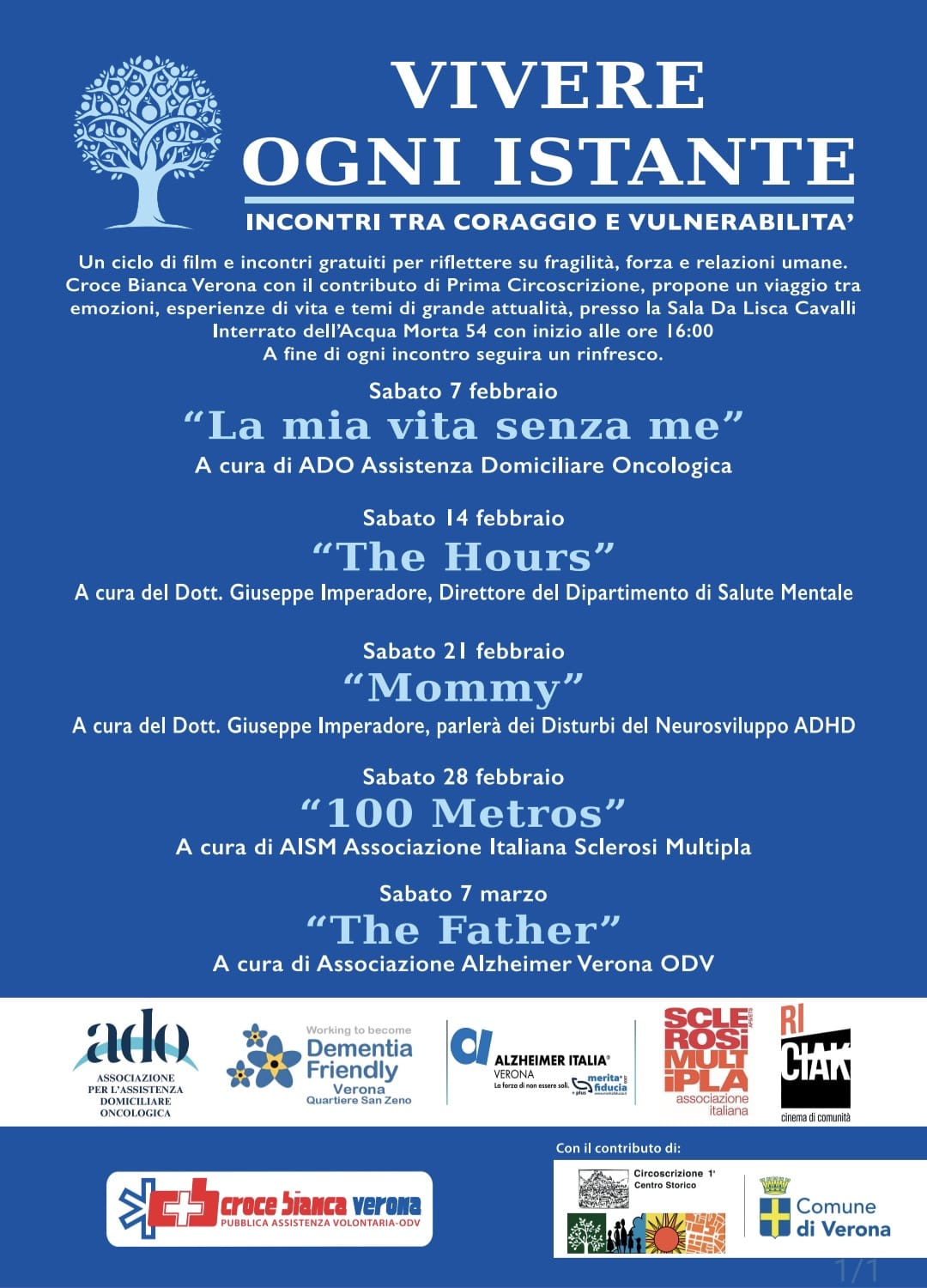 Croce Bianca Verona, con il contributo della Circoscrizione 1^, propone un viaggio tra emozioni, esperienze di vita e temi di grande attualità, un ciclo di proiezioni e incontri dal titolo “Vivere ogni istante: racconti tra coraggio e vulnerabilità”, che si terranno ogni sabato dal 7 febbraio al 7 marzo alla sala DA LISCA CAVALLI – Interrato dell’Acqua Morta 54 – con inizio alle ore 16.