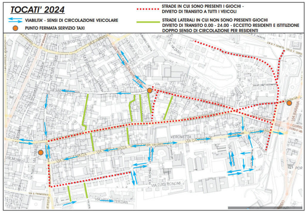 Ulteriori modifiche viabilistiche: dalle ore 16 del 13 settembre alle ore 24 del 15 settembre, viene istituito: doppio senso di circolazione nelle laterali alle vie in cui sono posizionati i giochi del Tocatì, altrimenti non raggiungibili: via Arduino; vicolo Madonnina; vicolo Colombine; via Maffi; vicolo Vetri; vicolo Storto; vicolo Lungo; vicolo Terrà; vicolo Fontanelle San Nazaro; tratti laterali di via Therzian, compresi tra la stessa e via Campofiore.