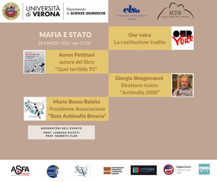 “Mafia e Stato” è il tema del settimo appuntamento della rassegna “Mafia in nove atti”, venerdì 26 marzo alle ore 21 su Zoom.